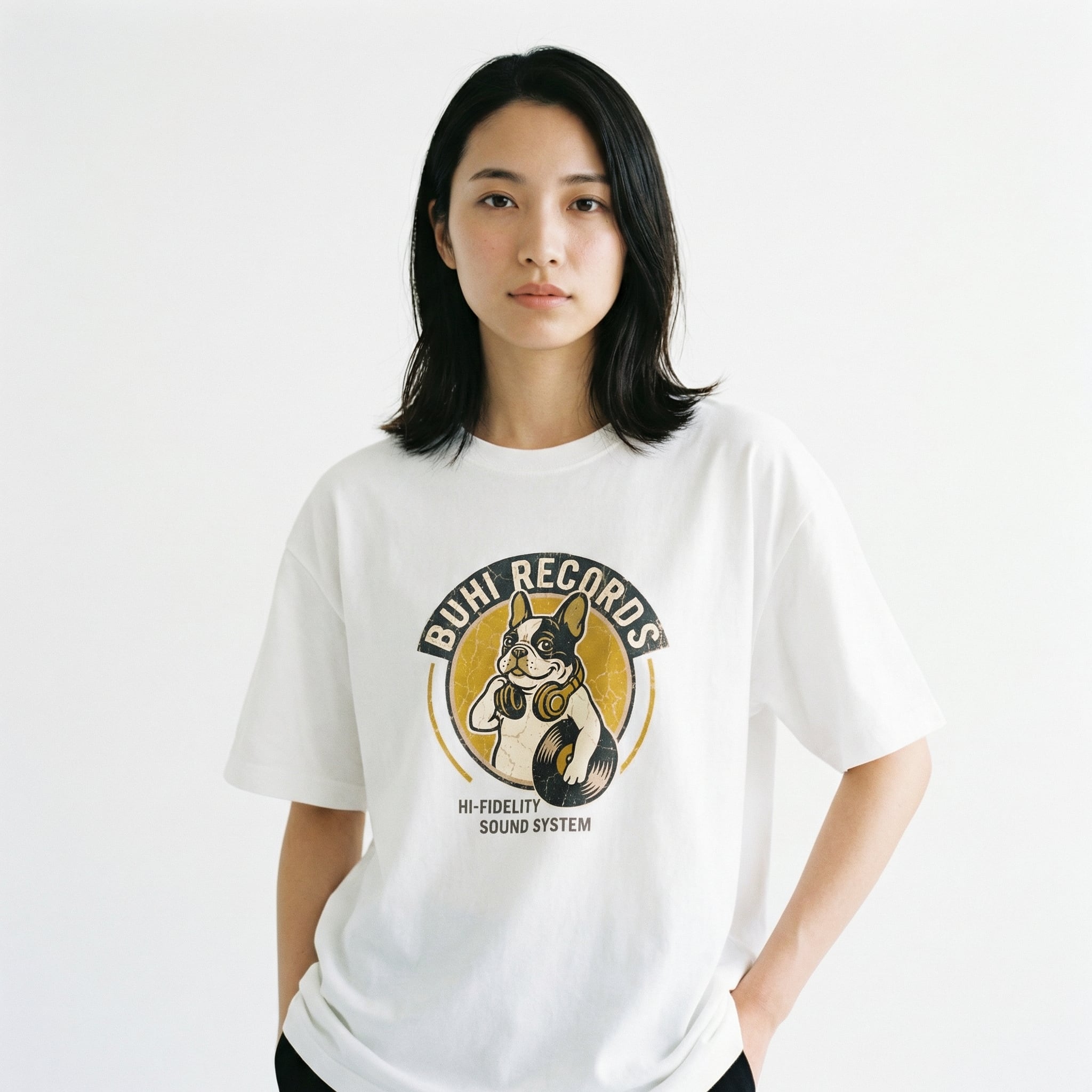 ヘッドフォンを首にかけ、レコードを抱えたフレンチブルドッグ。架空のレコードショップ「BUHI RECORDS」のスタッフTシャツという設定で、遊び心とヴィンテージ感を詰め込みました。