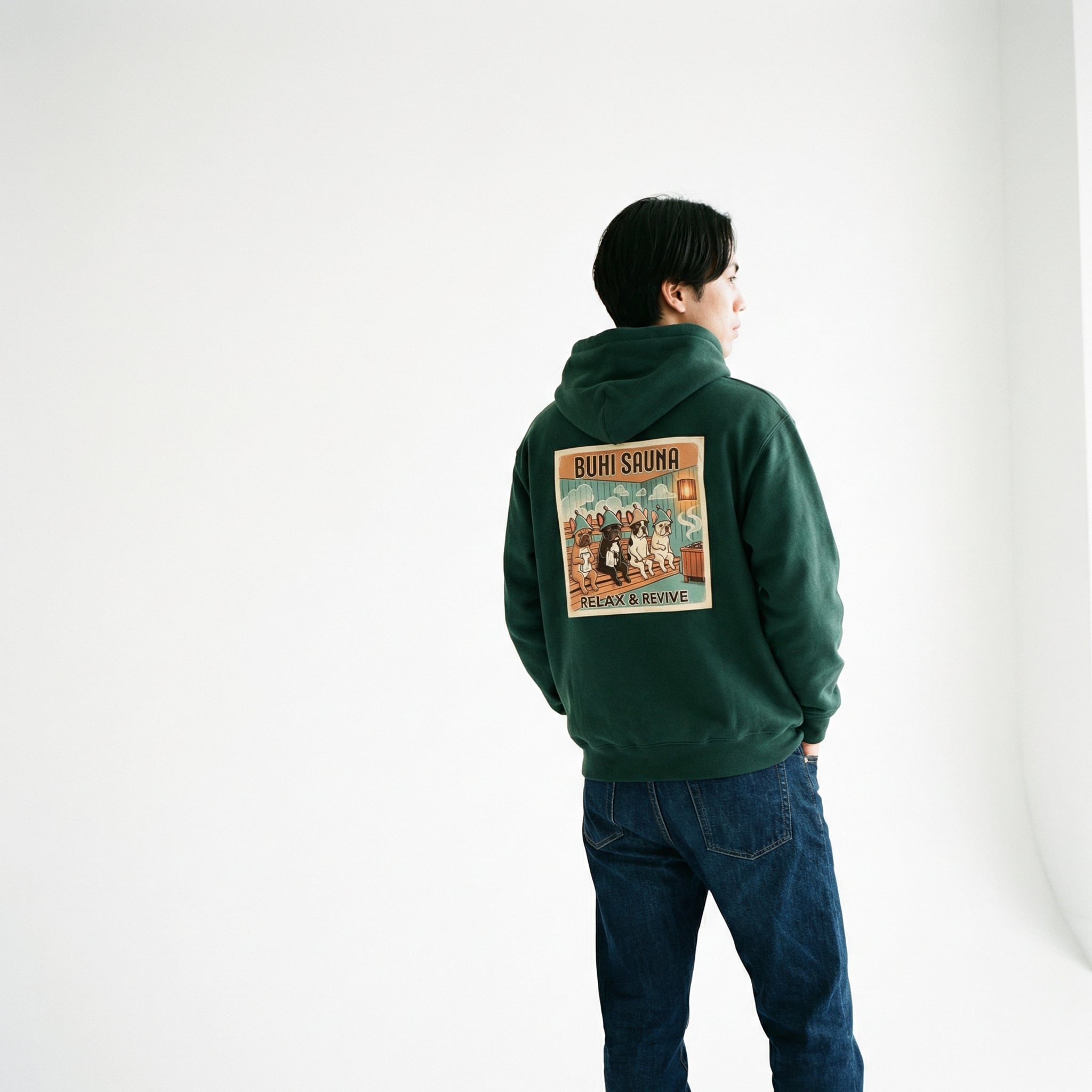 サウナでととのうブヒたちのイラストを胸元にあしらった、BUHI SAUNAシリーズのジップパーカー。フルジップだからサッと羽織れて、サッと脱げる。サウナ上がりの外気浴に、朝の散歩に、ちょっとそこまでの買い物に。気温に合わせて開け閉めできる「毎日の相棒」です。