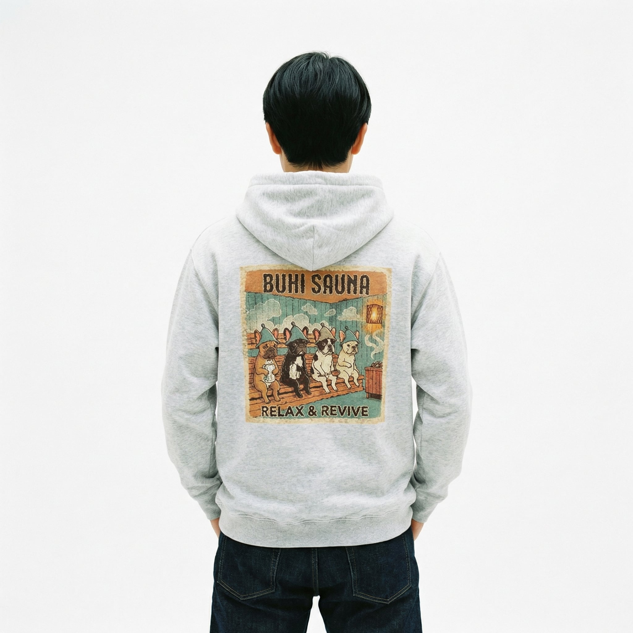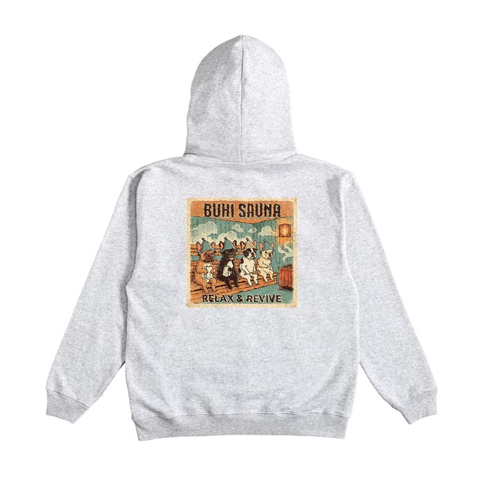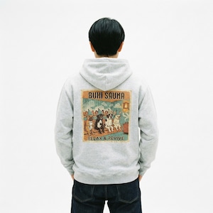 サウナでととのうブヒたちのイラストを胸元にあしらった、BUHI SAUNAシリーズのジップパーカー。フルジップだからサッと羽織れて、サッと脱げる。サウナ上がりの外気浴に、朝の散歩に、ちょっとそこまでの買い物に。気温に合わせて開け閉めできる「毎日の相棒」です。