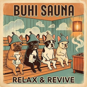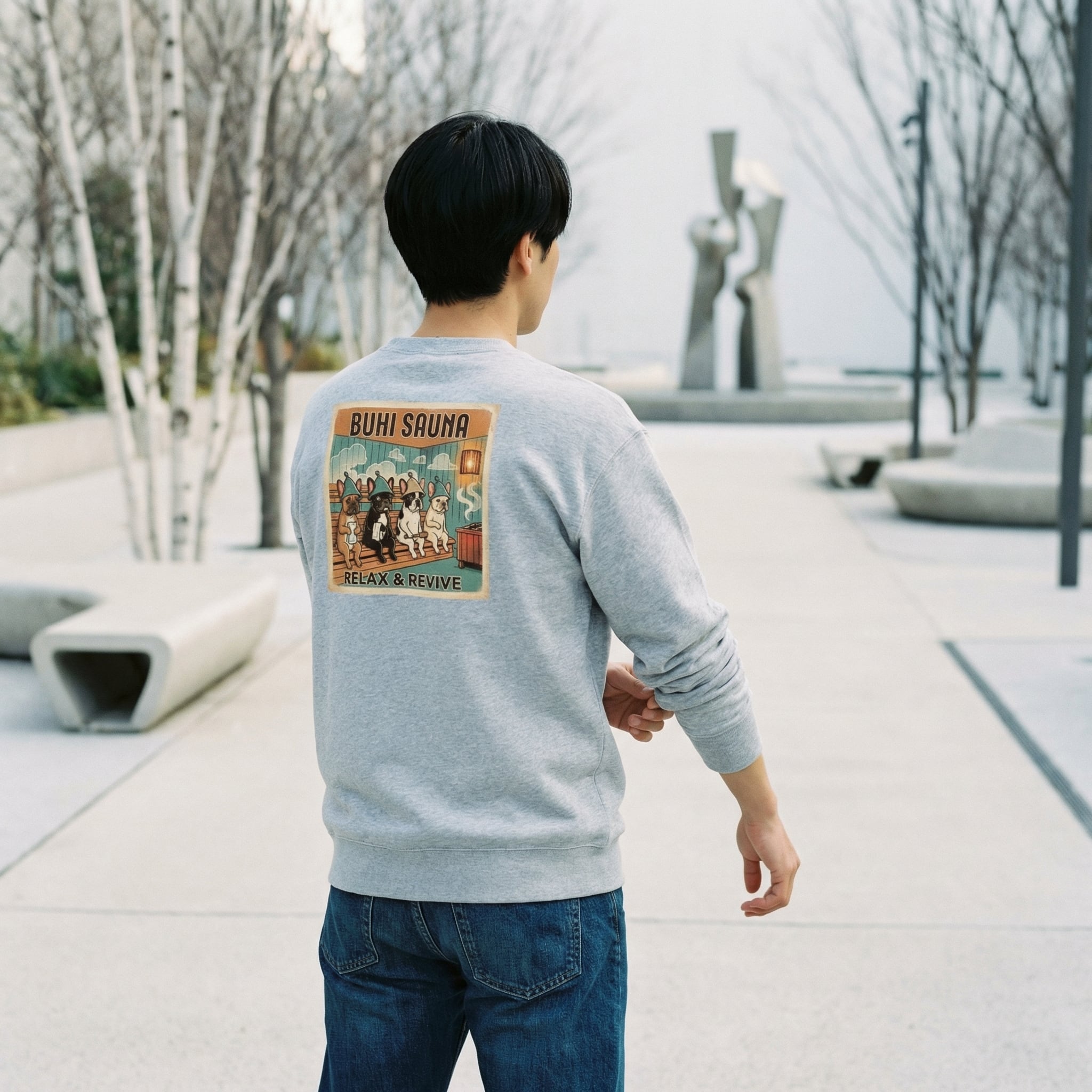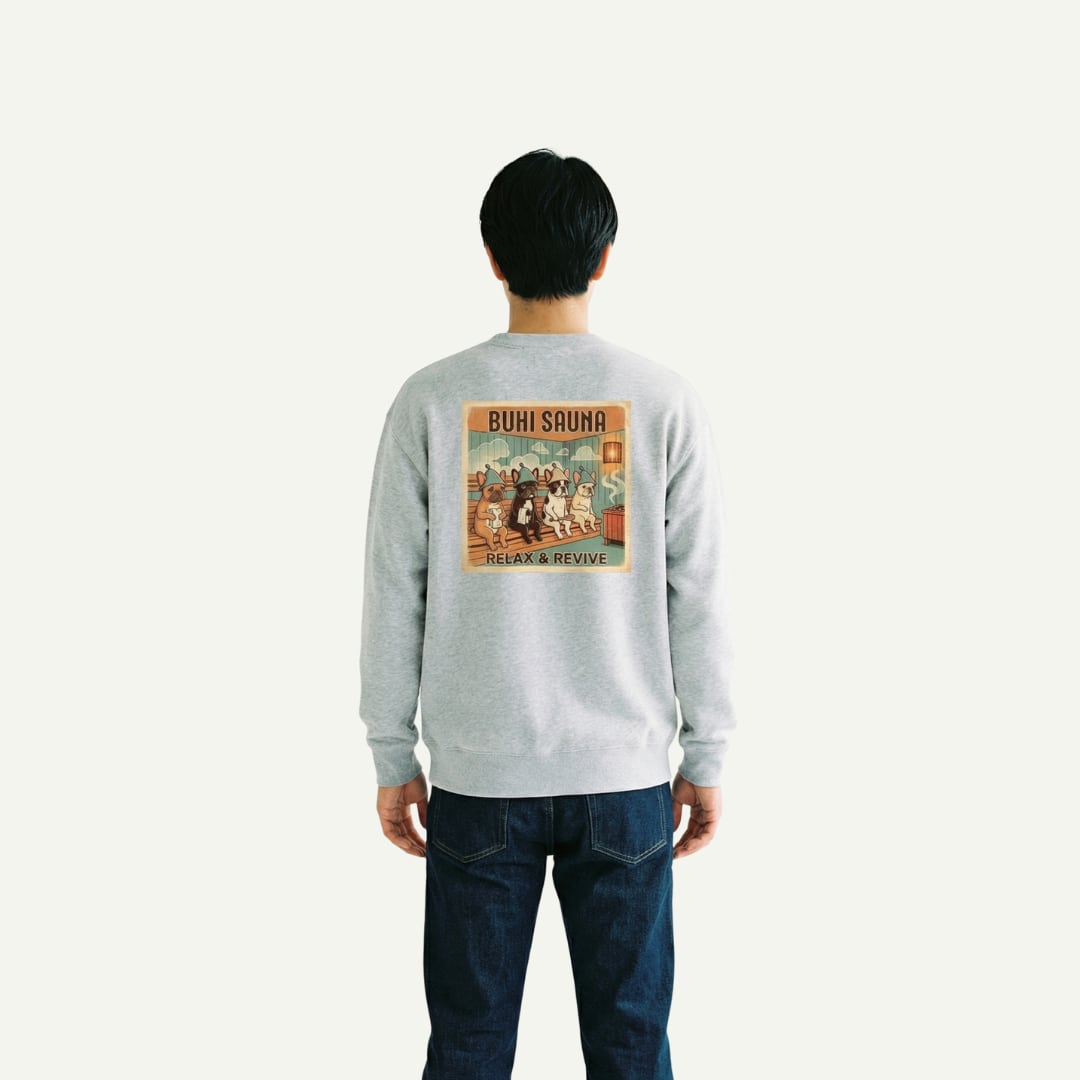 サウナハットを被ったブヒたちが背中に大きくプリントされた、BUHI SAUNAシリーズのトレーナー。「RELAX & REVIVE」のメッセージとともに、見た人を思わず脱力させるユーモアを背負って歩く1枚です。