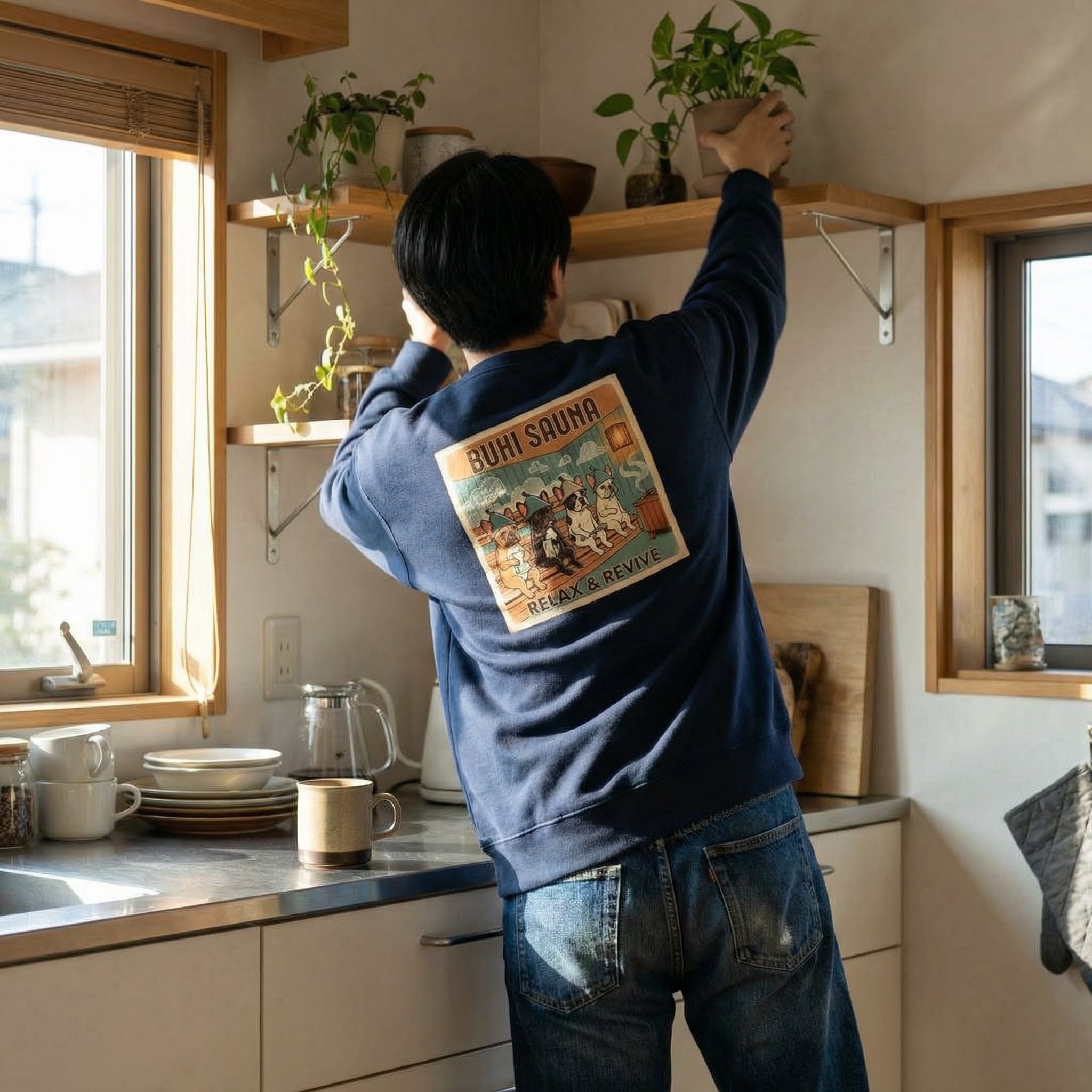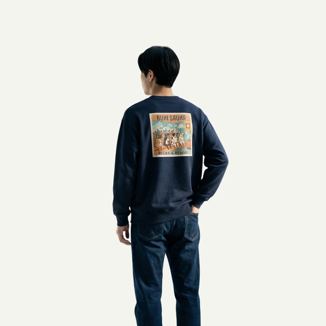 サウナハットを被ったブヒたちが背中に大きくプリントされた、BUHI SAUNAシリーズのトレーナー。「RELAX & REVIVE」のメッセージとともに、見た人を思わず脱力させるユーモアを背負って歩く1枚です。