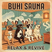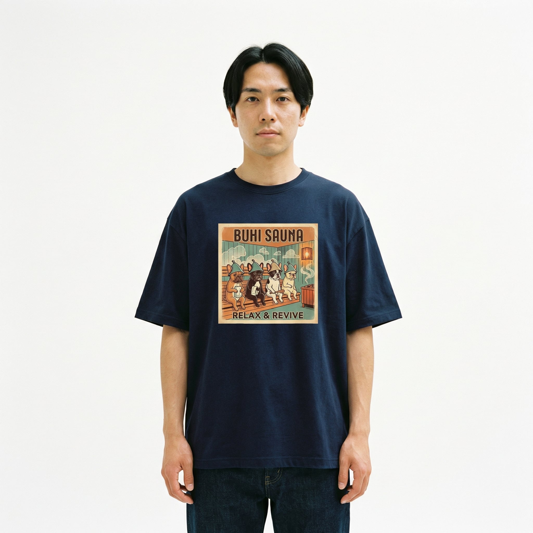 サウナでリラックスするフレンチブルドッグたちを描いた、思わず笑顔になれるグラフィックTシャツです。