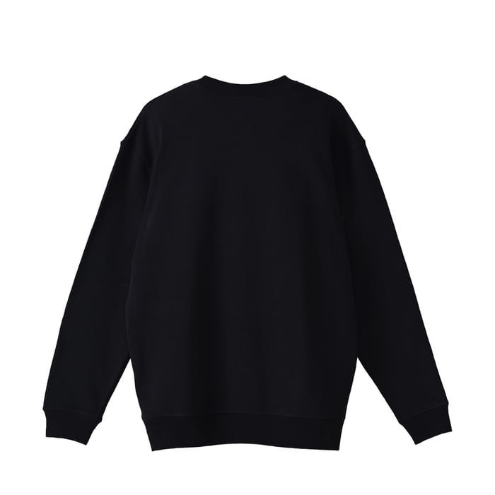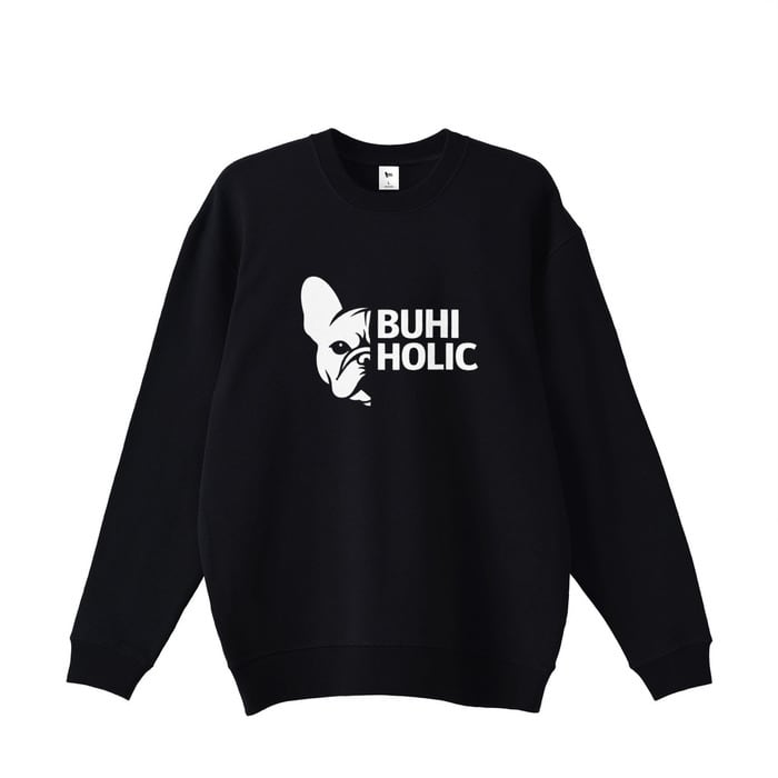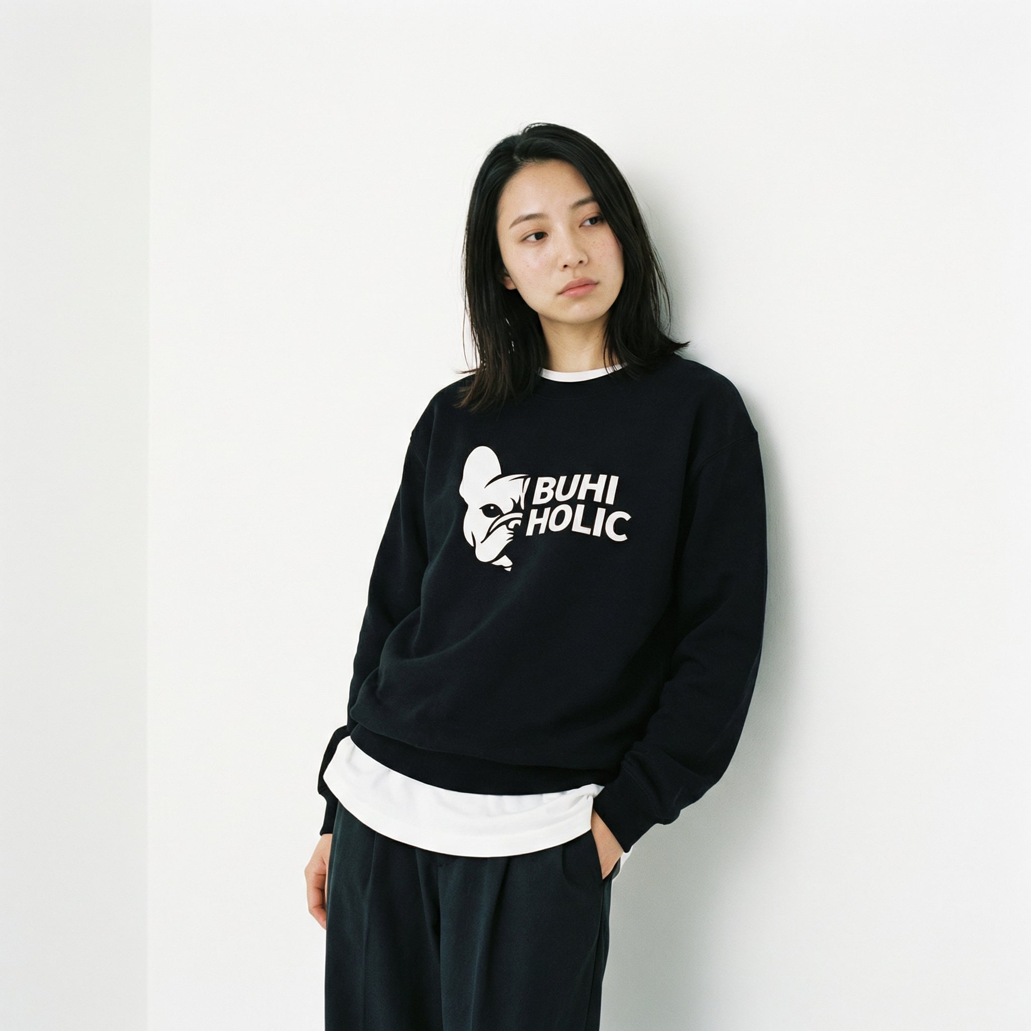BUHIHOLICのアイデンティティをそのまま纏えるブランドアイコントレーナー。フレンチブルドッグの横顔とブランドロゴを胸元に大胆に配置し、一目でBUHIHOLICであることが伝わるデザインに仕上げました。