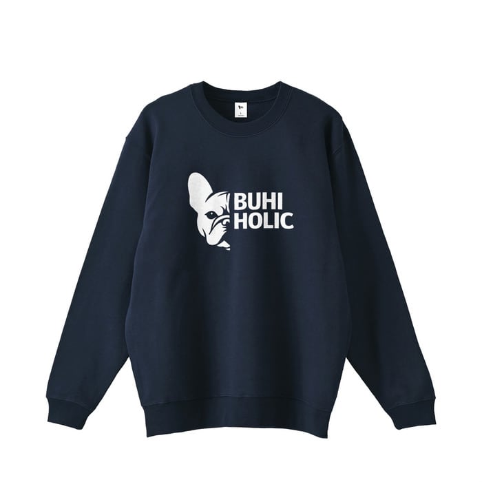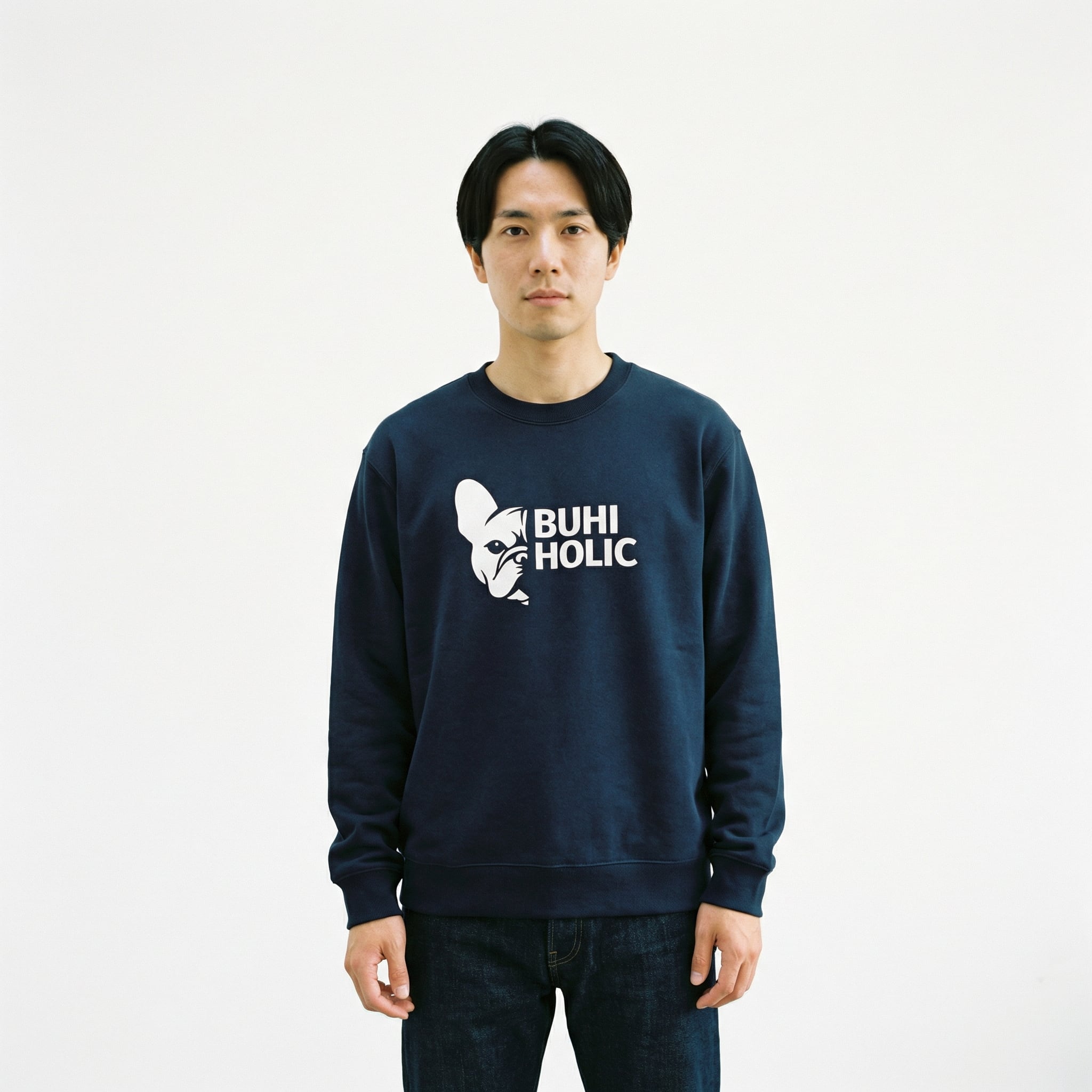 BUHIHOLICのアイデンティティをそのまま纏えるブランドアイコントレーナー。フレンチブルドッグの横顔とブランドロゴを胸元に大胆に配置し、一目でBUHIHOLICであることが伝わるデザインに仕上げました。