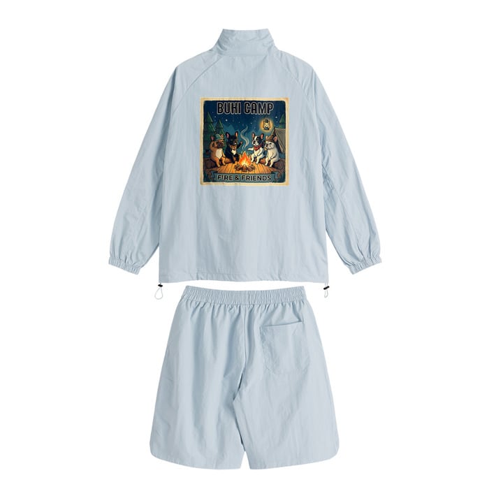 背中にはキャンプ帽とバンダナを身につけたブヒたちが焚き火を囲む「FIRE & FRIENDS」のイラストを大胆にプリント。