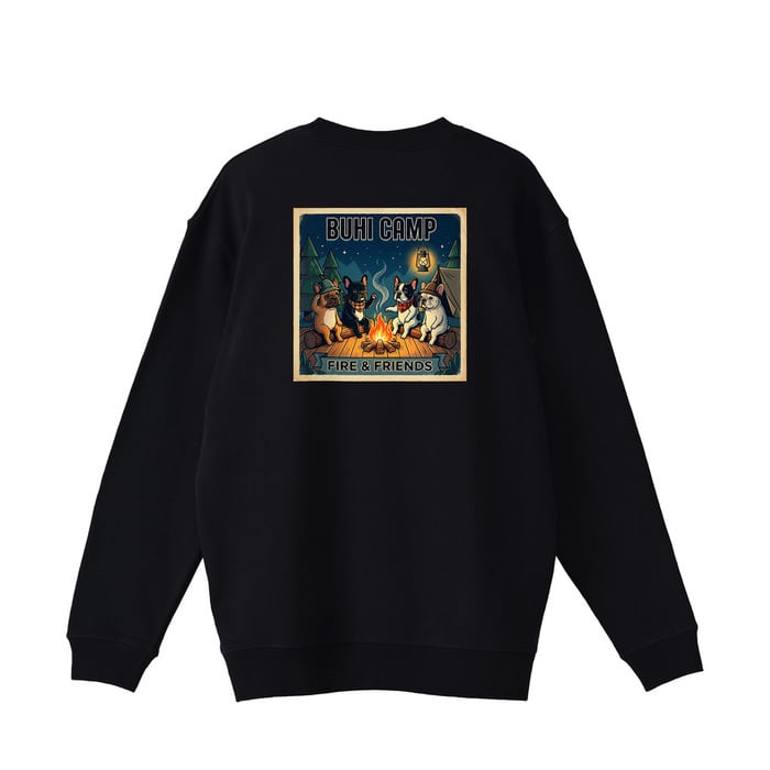 キャンプハットとバンダナを身につけたブヒたちが焚き火を囲む、BUHI CAMPシリーズのトレーナー。「FIRE & FRIENDS」のメッセージとともに、見た人の心にじんわり灯をともすバックプリントの1枚です。