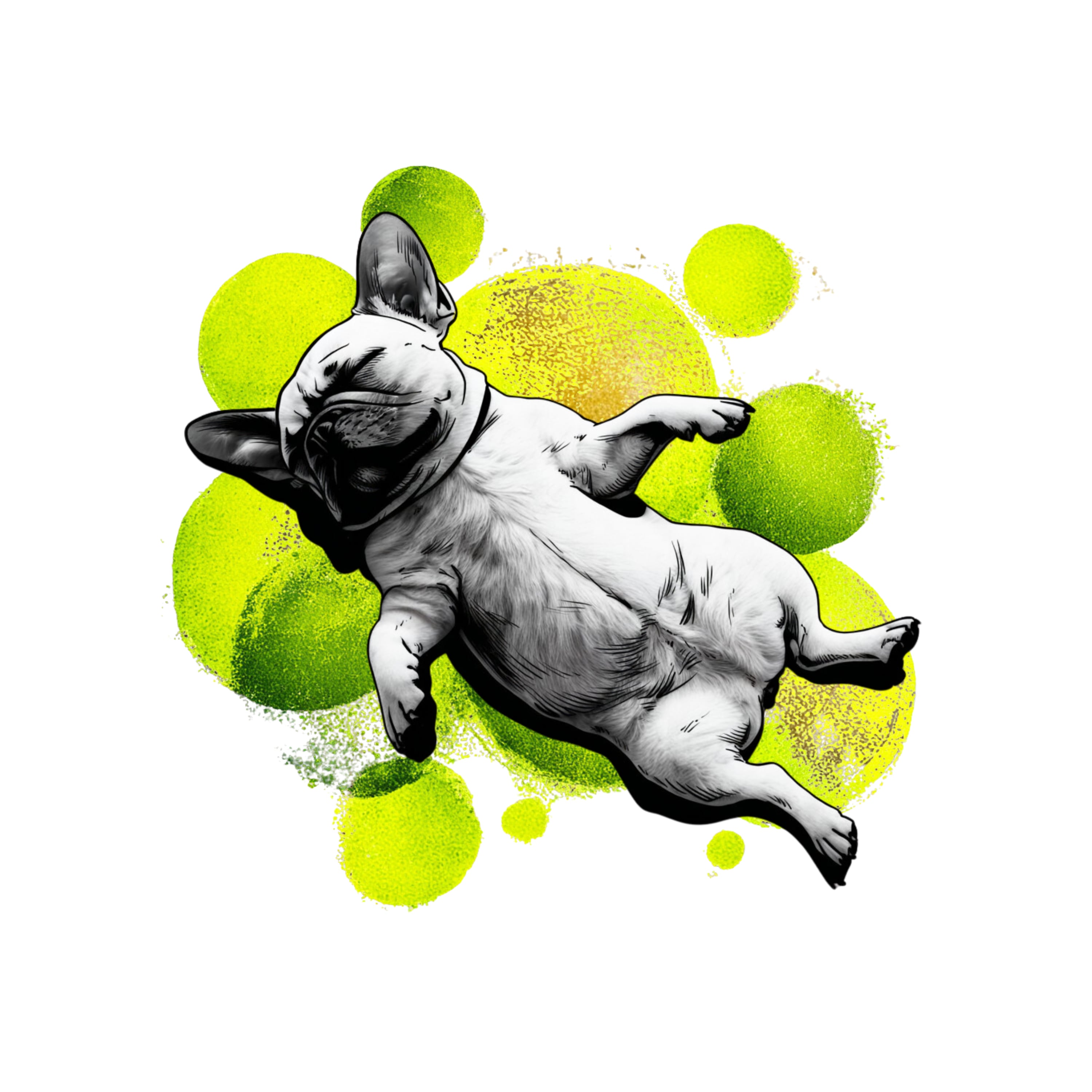 ソファの真ん中を堂々と占領し、ヘソ天で爆睡するフレブルの姿をモノクロアートとネオングリーンのバブルで描いたビッグシルエットTシャツ。